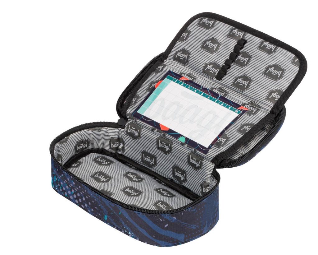 • Pevný penál na zip s dvojitou výklopnou chlopní a logem Baagl na přední straně. • Vnitřní kapsa na zip. • Kapsa se školním rozvrhem. • Logo Baagl je reflexní.