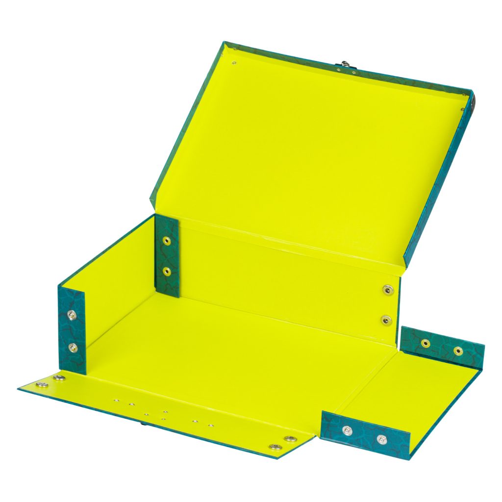 • Skládací kufřík z pevného laminovaného papíru s okovanými rohy.