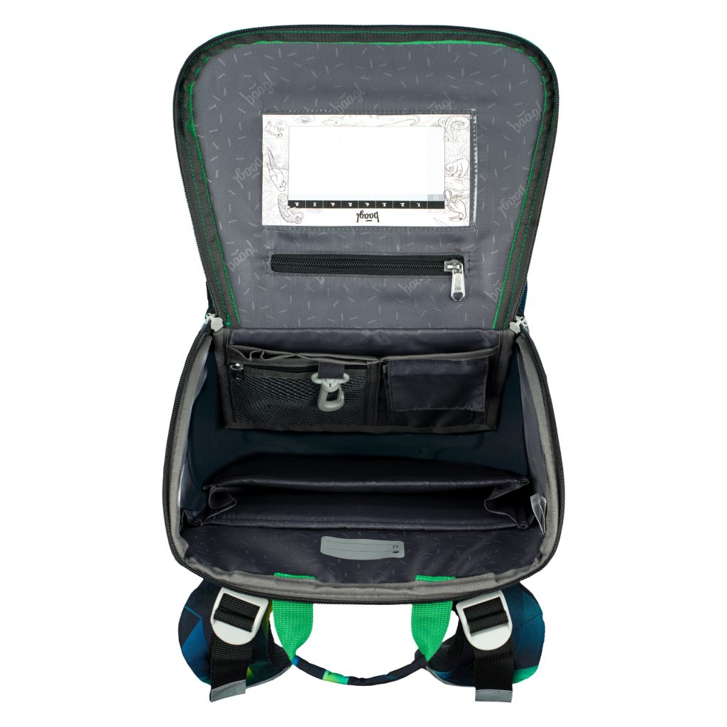 • Uvnitř aktovky je průhledná kapsa na rozvrh a vnitřní organizér umožňující rovnoměrné rozložení hmotnosti, doplněný gumičkou pro fixaci.