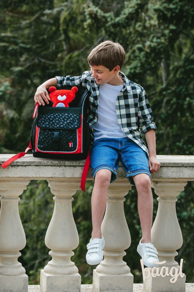 Černo-červená školní aktovka Zippy TERIBEAR s roztomilým plyšovým medvídkem na klopě. Je vhodná pro žáky 1. – 2. třídy ZŠ.