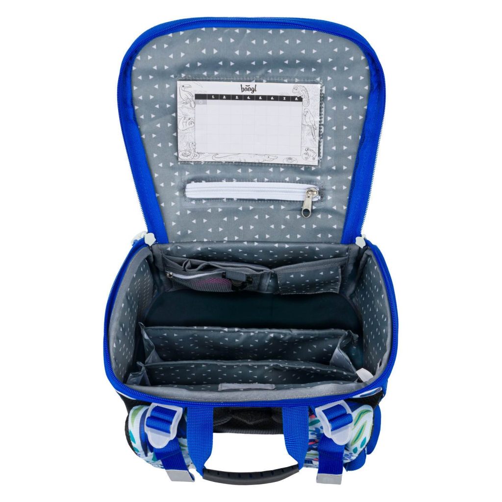 • Uvnitř aktovky je průhledná kapsa s rozvrhem a vnitřní organizér umožňující rovnoměrné rozložení hmotnosti, doplněný gumičkou pro fixaci.