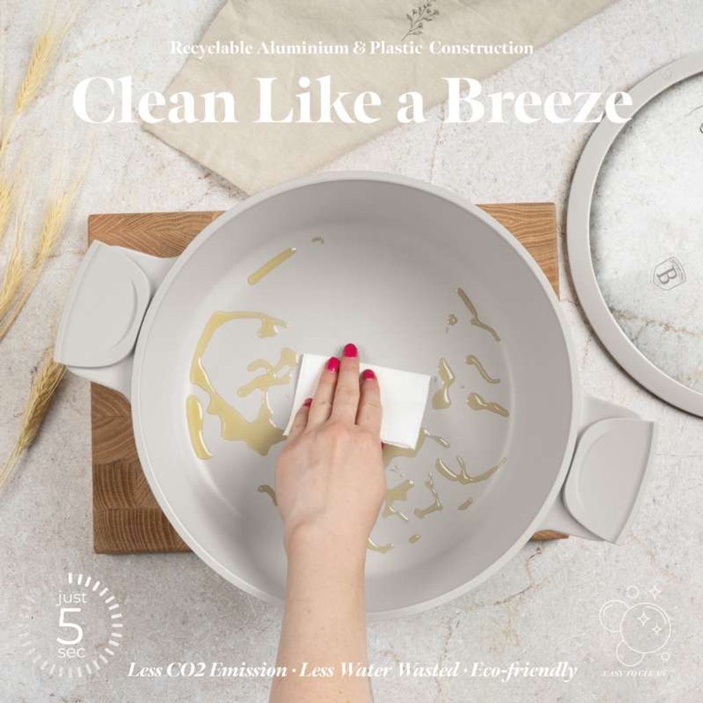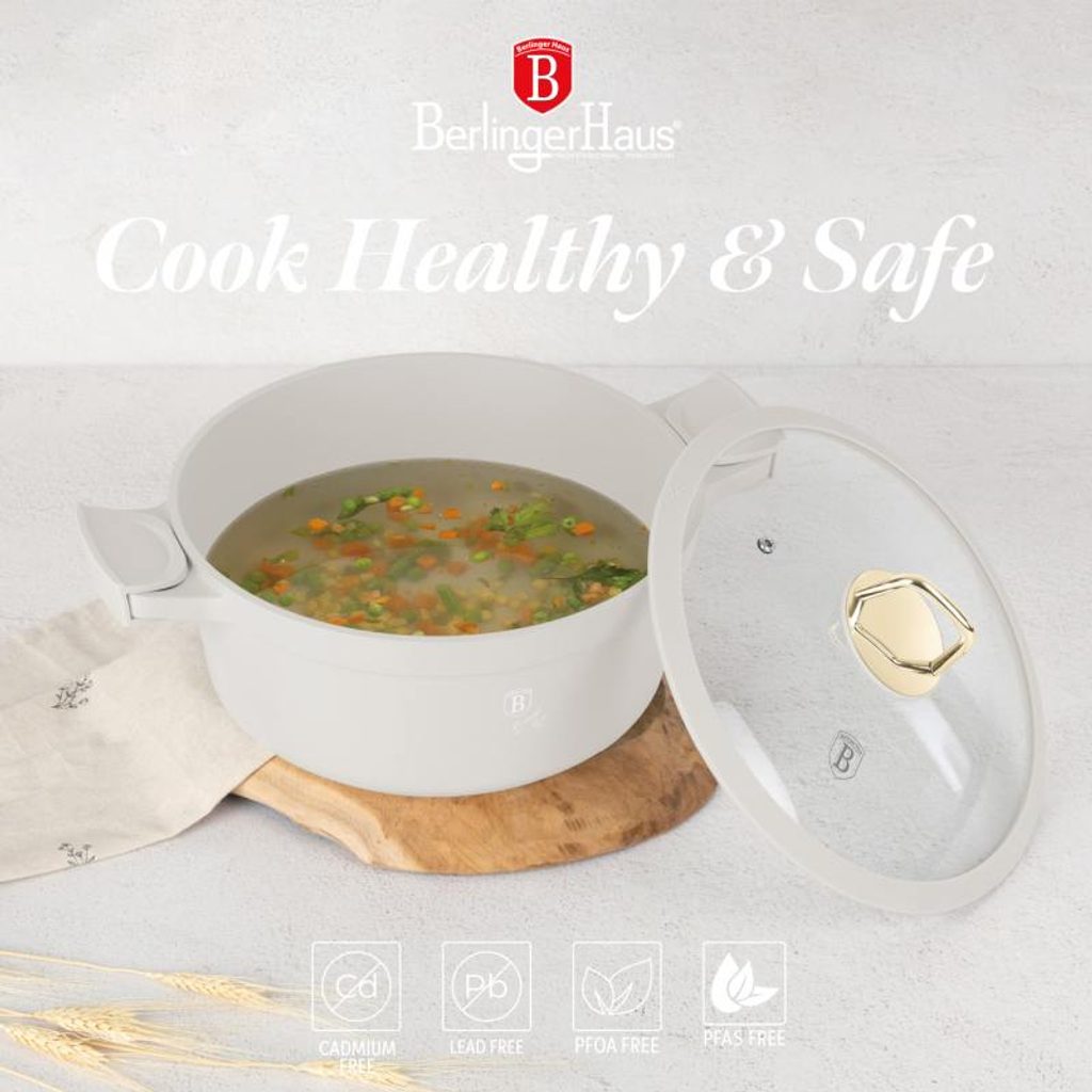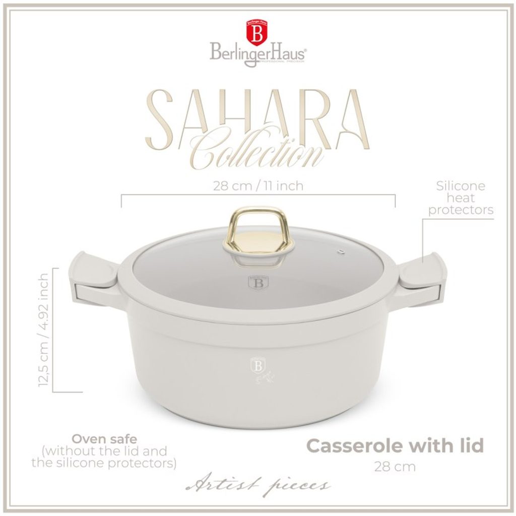Elegantní kastrol z kolekce Sahara Collection s titanovým povrchem je ideálním pomocníkem pro každodenní vaření. S objemem 6,6 l a průměrem 28 cm je vhodný pro přípravu různých pokrmů. Skleněná poklice se silikonovým okrajem zajišťuje bezpečné vaření, zatímco odnímatelné silikonové rukojeti umožňují snadnou manipulaci. Kastrol je kompatibilní s indukčními, sklokeramickými, plynovými i elektrickými varnými deskami a je vhodný také pro použití v troubě.