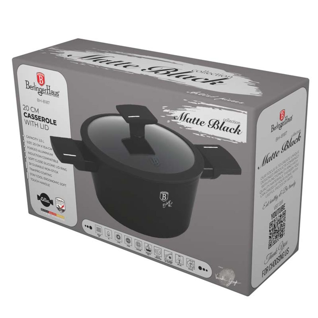 Tento hrnec je vyroben z kovaného hliníku s 3 vrstvým nepřilnavým povrchem TitanPro, který zajišťuje vysokou kvalitu a odolnost. Hrnec má rozměry 20x10,4 cm a objem 2,5 litru. Matná černá barva a minimalistický styl dodávají hrnci moderní vzhled. Ergonomická rukojeť Soft Touch Stay Cool zajišťuje pohodlné a bezpečné používání. Cedící poklice je vyrobena z tvrzeného skla s tepelně odolným silikonovým systémem Soft Close.