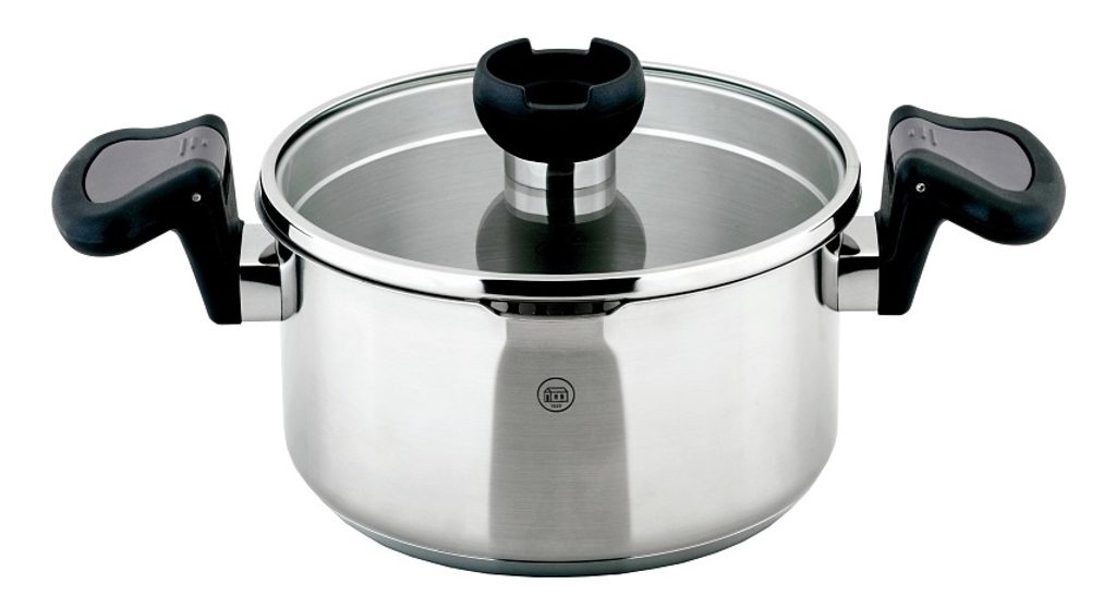 - vnitřní části rukojetí lze ohnout směrem k poklici a zajistit ji tak aby nevyklouzla při cezení, pohodlná vychytávka oceněná Reddot Design Award