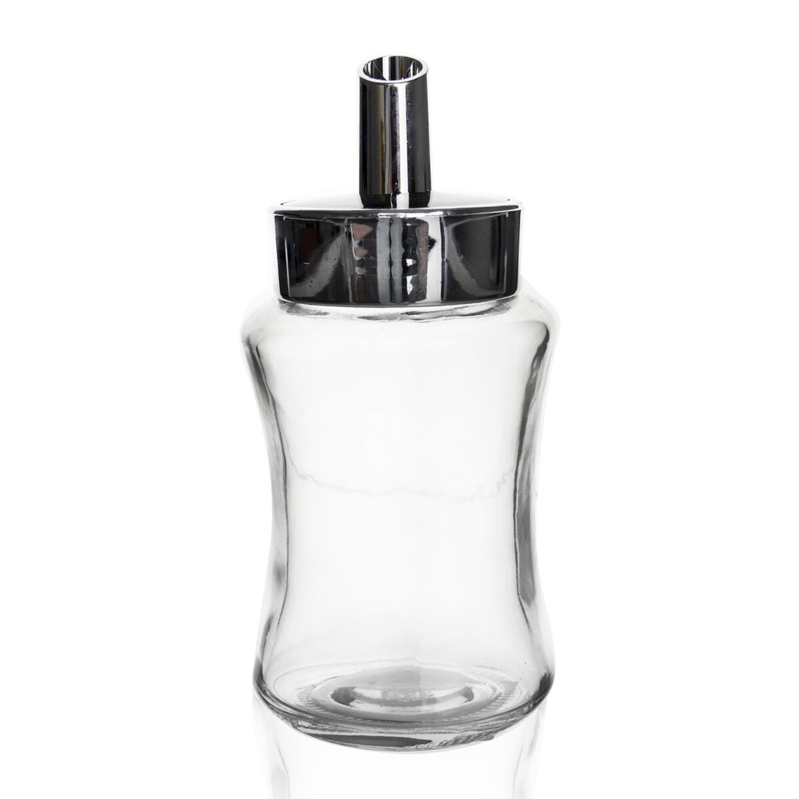 Cukřenka. Materiál: sklo, plast. Rozměry: pr. 7 cm, v. 14,5 cm.
