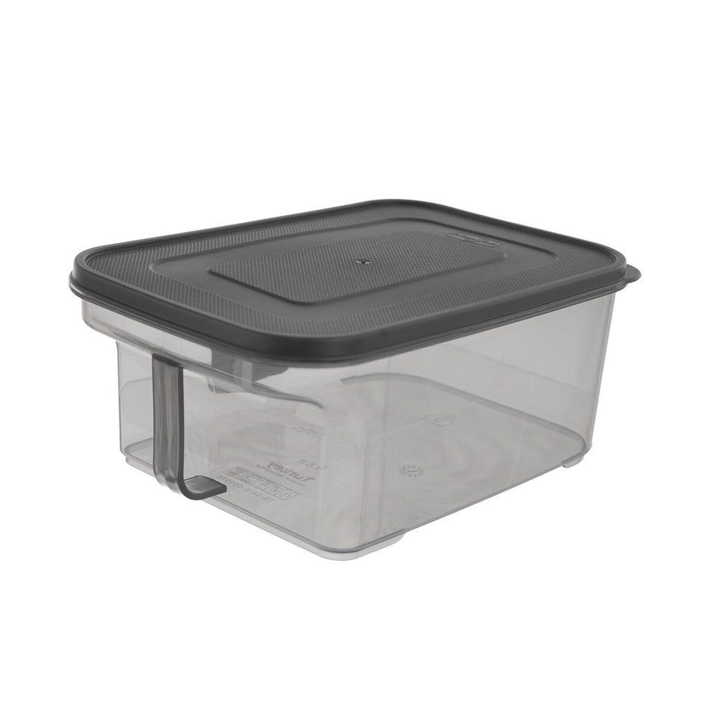 Zásobnice na potraviny s víčkem a s držadlem. Pohodlně a přehledně uloží mouku, cukr, sůl, krupici… Díky uchu je velmi pohodlná na manipulaci. Víčko zabrání rozsypání, zvlhnutí, přejímání vůní a chutí z ostatních potravin uložených ve skříňce. Díky transparentnosti máte na první pohled přehled o obsahu zásobnice. Díky tvarovanému víčku dobře stohovatelné. Materiál: PP plast. Odolná teplotám od -25 °C do +95 °C. Rozměry: objem 2,6 l, 23x16x10 cm. Vhodná do myčky na nádobí, bez víčka také do MVT.