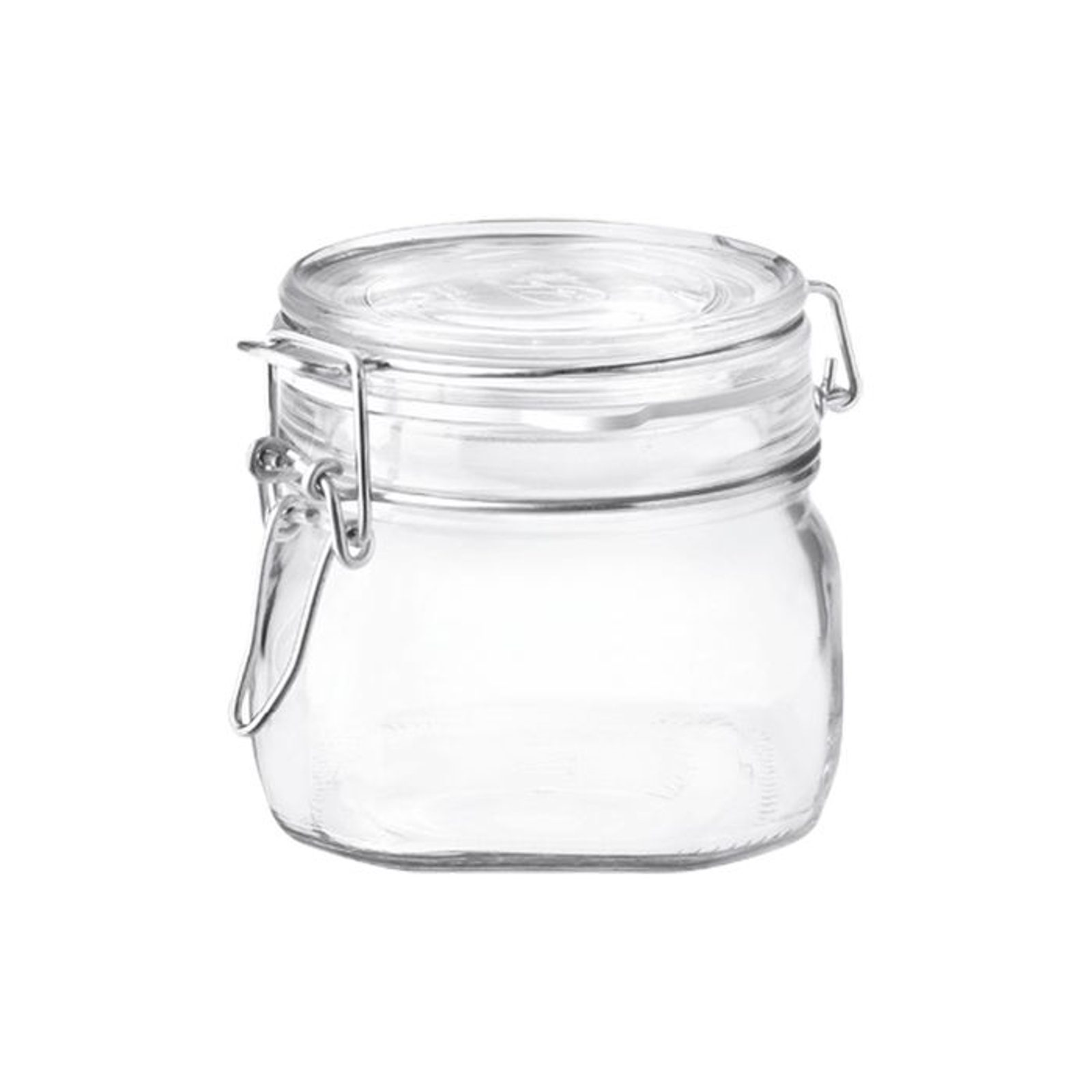 Dóza Fido 0,5l. Masivní čiré sklo čtvercový tvar, drátěný patentní uzávěr s pryžovým těsněním a skleněným víčkem průměr 10,6cm, výška 9,8cm, možno využít pro zavařování, uchování potravin nebo pro dekoraci. Vyrobeno v Itálii.