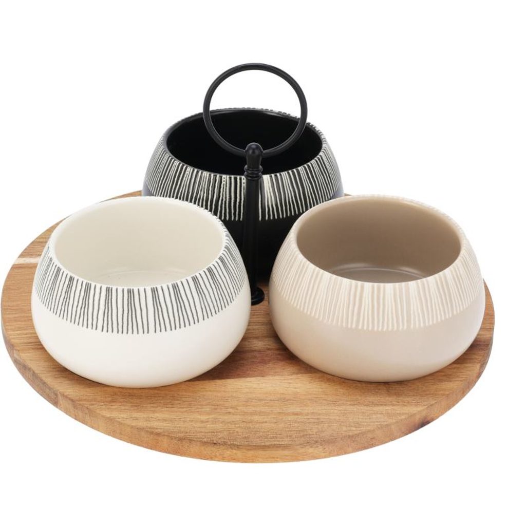 Dodejte svému stolu výjimečný vzhled. Tato servírovací sada v sobě spojuje přírodní eleganci akáciového dřeva, nadčasový vzhled kameninových misek a industriální akcent díky kovové rukojeti v matné černé barvě. Skvělé pro servírování pochutin, dipů či dezertů.