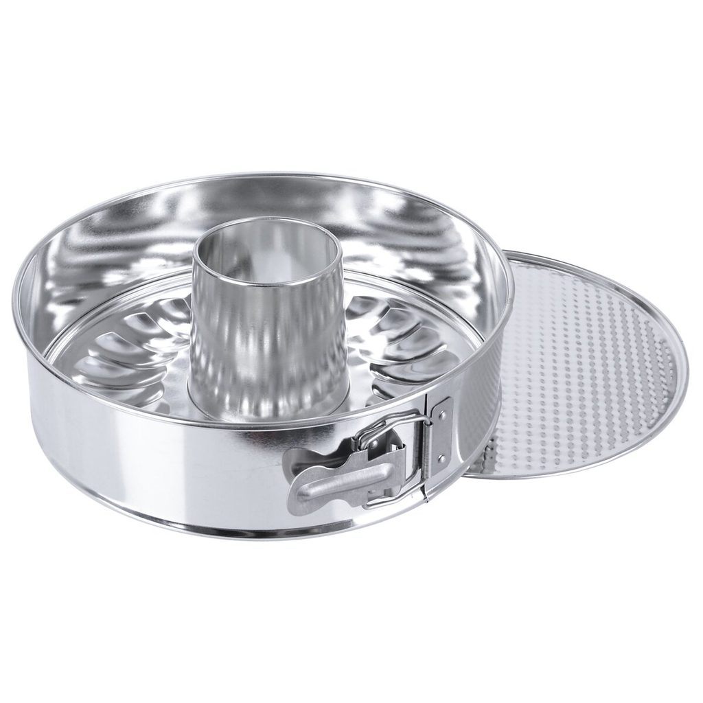 Forma na bábovku se 2ma odnímatelnými dny je opatřena přezkou pro snadné vyjmutí korpusů, dortů. Využijete ji pro pečení sladkého pečiva, masových dobrot i k přípravě nejrůznějších aspiků a nepečených zákusků. Materiál: pocínovaný plech. Max. do 230 °C. Buď vytvoříte kulatý tvar korpusu nebo bábovku. Rozměry: pr. 24cm, v. 7,5/8,5 cm.