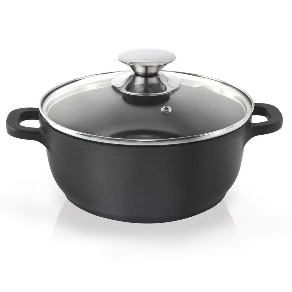 Masivní hrnec s poklicí s velmi kvalitním nepřilnavým povrchem PFLUON GRANIT. Můžete v něm vařit, smažit, dusit, opékat a zapékat s minimální potřebou tuku. Připravovaný pokrm se nepřipéká. Poklice s otvorem pro únik přebytečné páry. Vhodný na všechny typy spotřebičů včetně indukce i trouby. Materiál: hliník s vynikajícím nepřilnavým povrchem PFLUON GRANIT a s profilovaným dnem, sklo, nerez. Rozměry: objem 4 l, pr. 24 cm, v. 10/16 cm. Doporučujeme použití kuchyňské chňapky. U plynových sporáků volte správnou velikost plamene, u elektrických, sklokeramických a indukčních vařičů je nutné zvolit odpovídající velikost ploténky. Připravovaný pokrm lze na sporáku připravit a pak jej vložit do trouby. Připravené jídlo můžete pohodlně skladovat v hrncích také v chladničce. Při použití v troubě poklice max. do 200 °C. Lze mýt v myčce na nádobí.