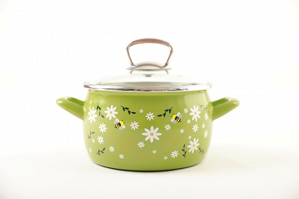 Smaltový hrnec s dekorem drobných kvítků a včeliček. Uvnitř nádoby je nazelenalý smalt, který ladí s vnějším smaltem. Hrnec je opatřen poklicí s nerezovým úchytem. Může být tedy použit i v troubě.