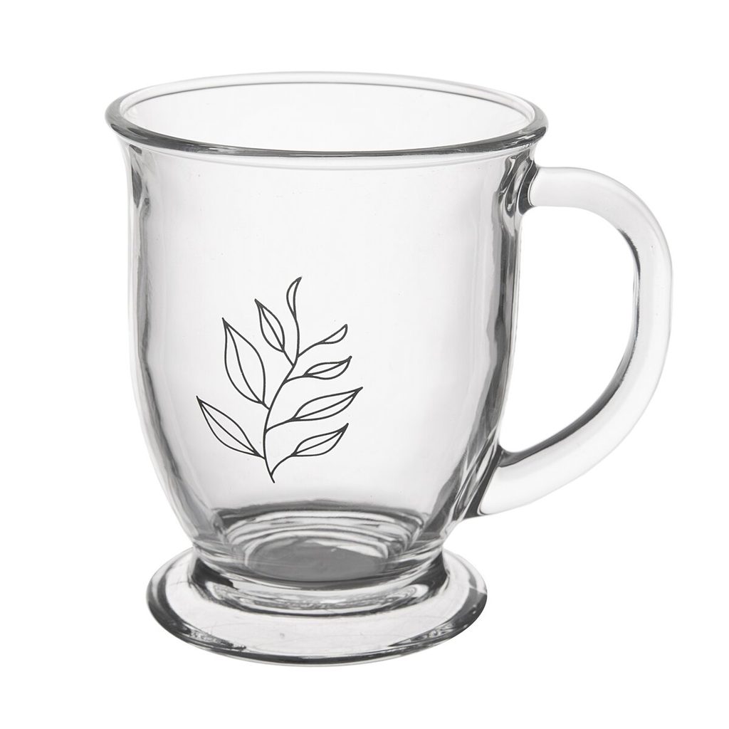 Hrnek na čaj s uchem s jemným dekorem. Materiál: sklo. Rozměry: objem 0,45 l, pr. 9,5 cm, v. 11,8 cm. Lze mýt v myčce a použít v MVT.