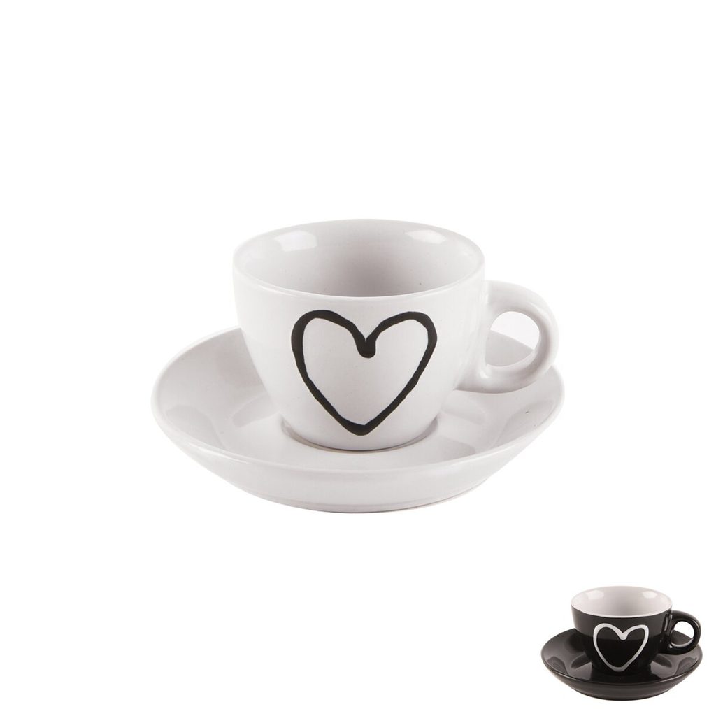 Hrnek s podšálkem. Materiál: keramika. Dekor srdce, assort barev. Rozměry: objem 0,09 l, pr. 6 cm, v. 4,5 cm, pr. podšálku 11 cm.