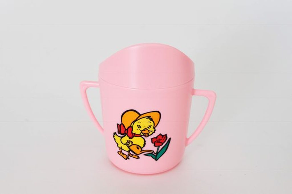 hrníček 0,23l kojen. RŮŽ.+bar.potisk, pítko, plast
