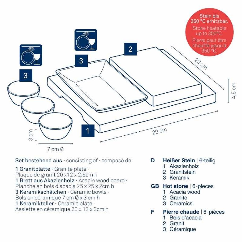 KELA Servírovací misky žhavý kámen XL Country akátové dřevo tmavě šedá 29,0x23,0x4,5cm KL-16629 Sada skládající se z žulového talíře 20x12x2,5cm h s deskou z akáciového dřeva 29 x 23 x 2cm h včetně 3 bílých keramických misek 7x3cm h 1 bílý keramický talíř 20x13x3cm h