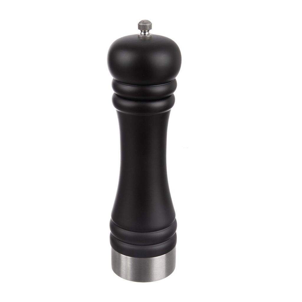 Mechanický černý mlýnek na sůl, pepř nebo jiné koření Vám umožní mít Vaše oblíbené koření vždy po ruce. Můžete ho umístit na volnou plochu kuchyňské linky všude tam, kde je právě zapotřebí. Čerstvě namleté koření má lepší chuť i vůni. Možnost nastavení hrubosti mletí pomocí matice v horní části mlýnku. Nedotahujte ji příliš na pevno, nešlo by pak hlavicí otáčet a mlít. Pro naplnění mlýnku stačí odšroubovat horní matici a oddělit hlavici. Materiál: gumovníkové dřevo s polyuretanovým lakem, který chrání dřevo před poškrábáním, hliník (matice + závitová tyčka uvnitř), nerezová ocel (spodní část mlýnku), keramický mlecí mechanismus mlýnku. Rozměry: pr. 5,7 cm, v. 21,5 cm.