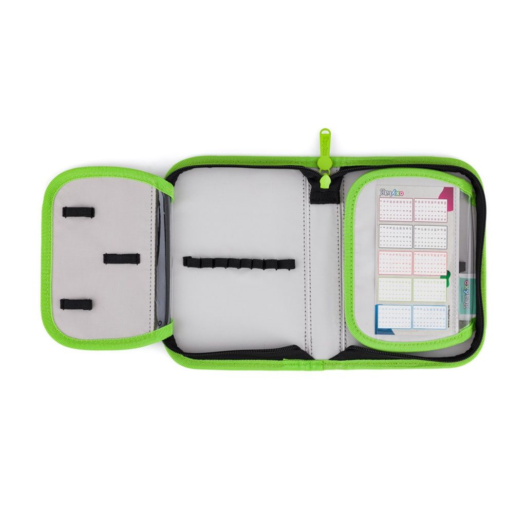 Jednopatrový školní penál s 2 chlopněmi, prázdný obsahuje 25 gumových poutek pro uchycení psacích potřeb. Na vnitřních chlopních jsou průhledné fólie pro rozvrh hodin.