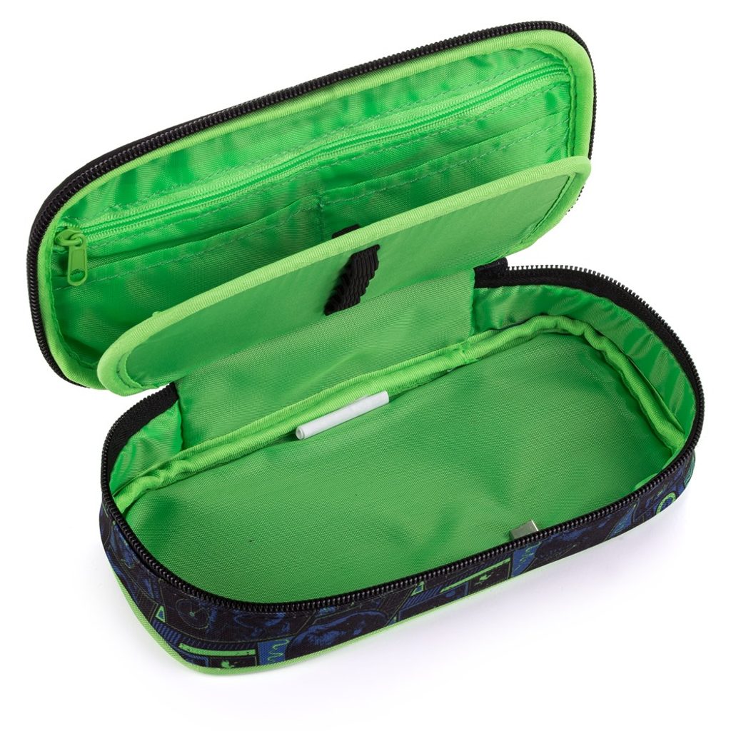 Školní pouzdro etue s motivem Jurského světa. Školní pouzdro je opatřeno pevnými zipy, síťovanou kapsičkou na zip a klopou s pevnými poutky po obou stranách. Pod klopou je místo pro volné uložení psacích potřeb nebo jiných drobností. Vhodné pro školáky na 2. stupni a starší studenty. Pouzdro je lehce omyvatelné.