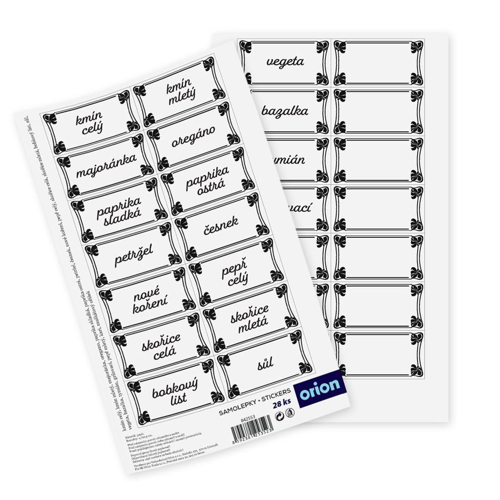 Samolepky na koření. Obdélníkový tvar. 28 samolepek s popisem, 7 prázdných. Rozměry: 1 samolepka 4,7x2,4 cm.