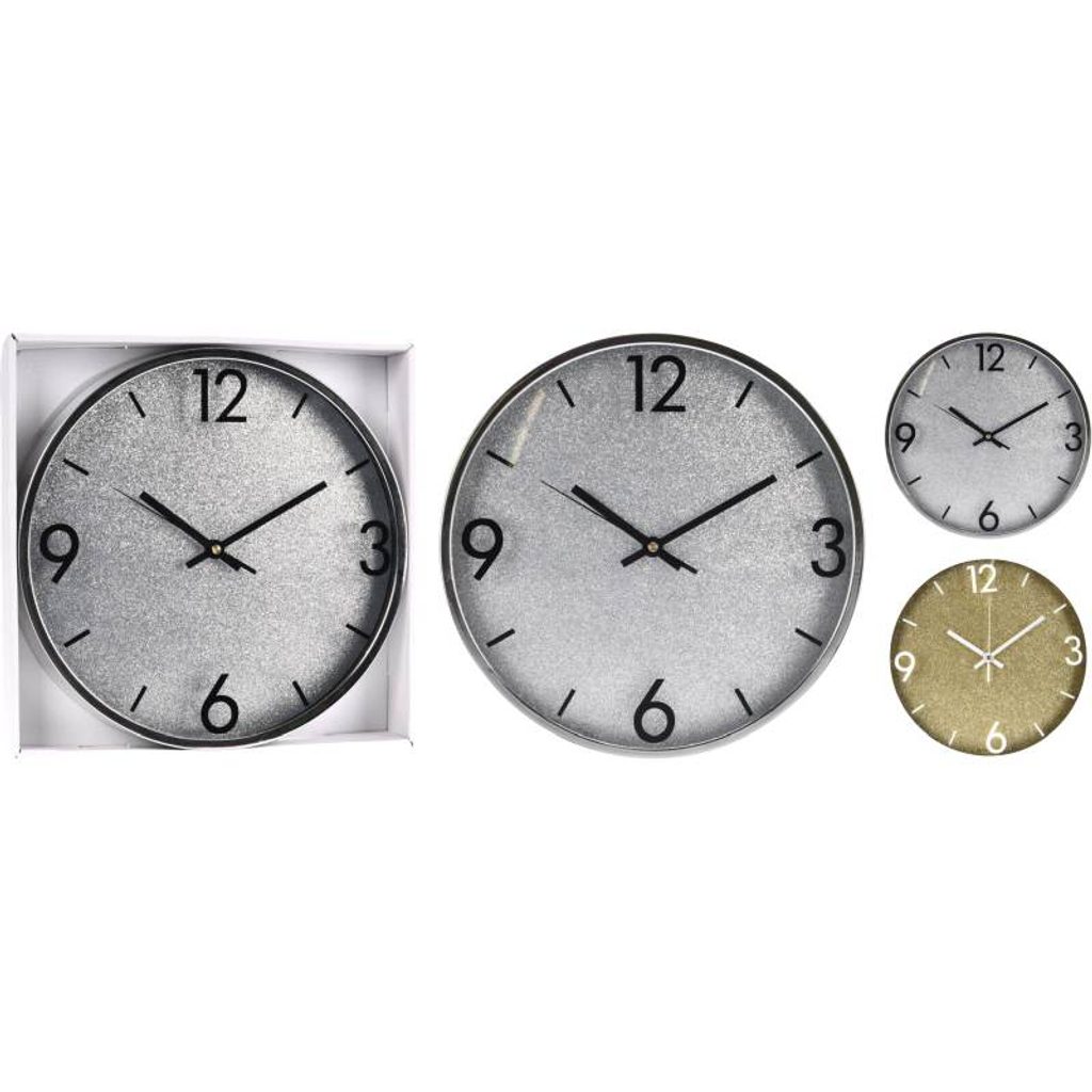 Kovové nástěnné hodiny s ciferníkem s třpitkami - galvanicky pokovený rámeček - napájení pouze na 1 tužkovou aa baterii (není součástí hodin) - dobře čitelný ciferník - rozměry: 31 x 5 cm - barva: stříbrná a zlatá