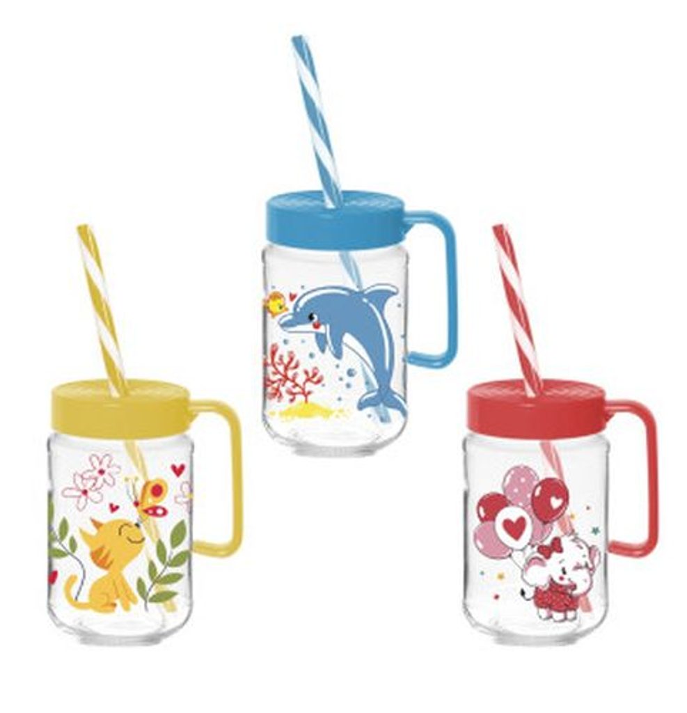 sklen. 370ml, 1ks, s uchem, Delfín, Kočka, Slon, brčko, sklo