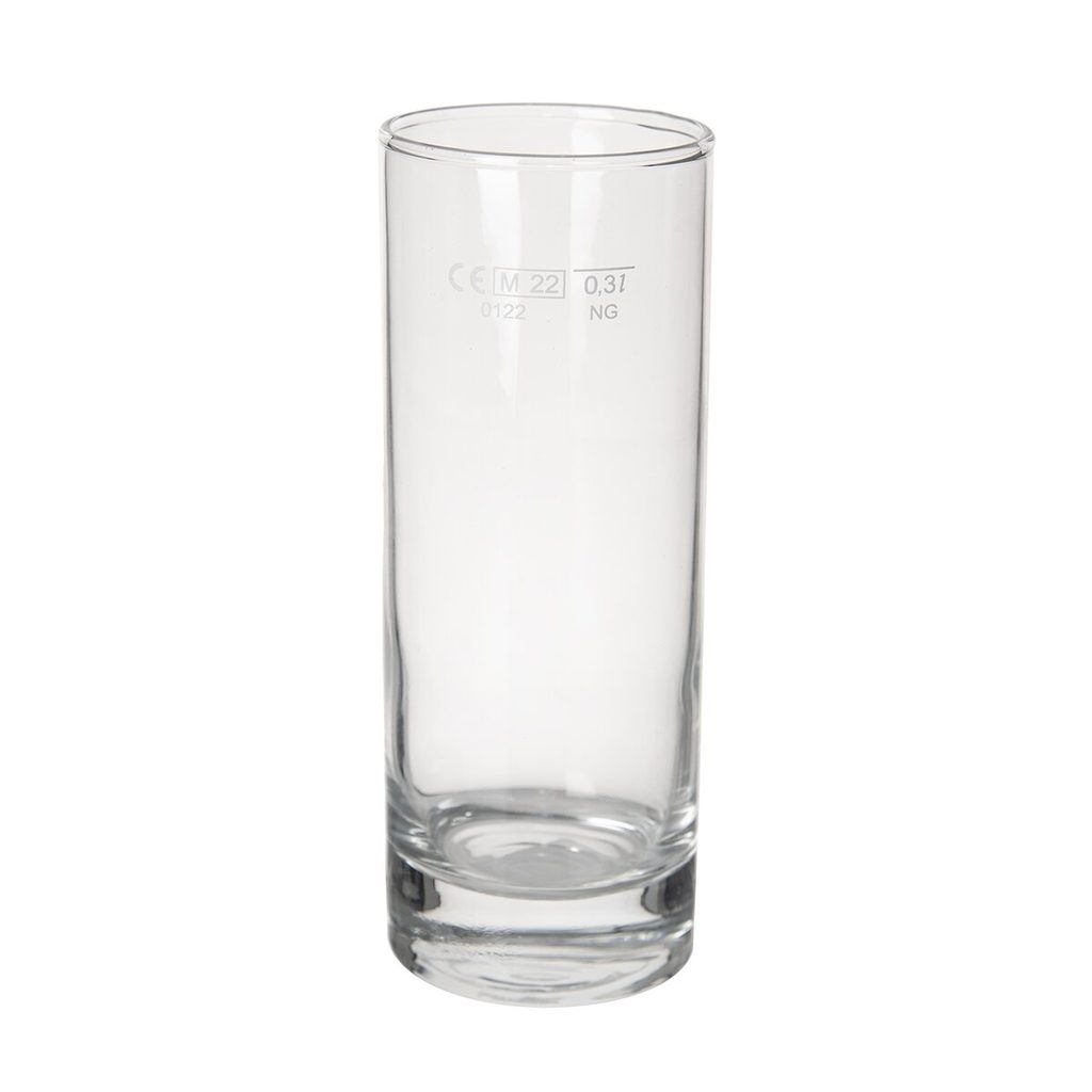 Sklenice s cejchem 0,3 l. Materiál: sklo. Rozměry: celkový objem 0,33 l, pr. 6 cm, v. 16 cm. Možno mýt v myčce a použít v MVT.