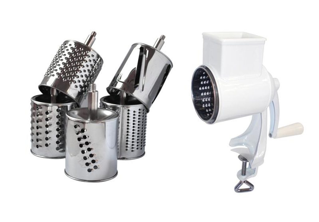 Mlýnek pro snadné a rychlé mletí sýrů a ořechů, vyroben z kovu a nerezavějící oceli, snadné použití a údržba, 5 ks výměnných nástavců - na strouhanku, sýr, zeleninu či ovoce na plátky apod., vhodné…