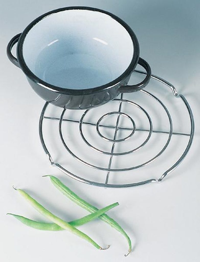 Podložka pod hrnec - kulatá, na odkládání hrnců i kastrolů všech velikostí, také je vhodná k odložení při vaření i servírování. Vyrobená z pochromovaného kovu. Rozměry podložky - 19,7 x 0,9 cm.